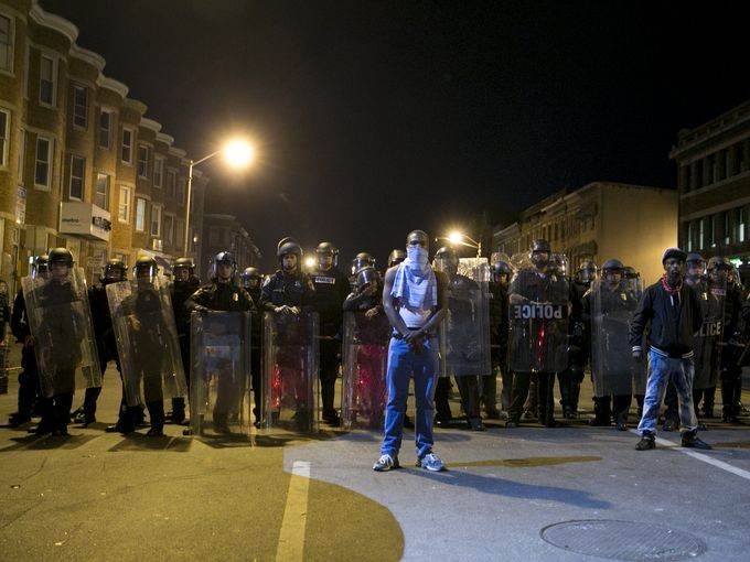 Cư dân khu phố đứng trước mặt cảnh sát chống bạo trong khu vực bạo loạn trước đó ở Baltimore, Md., Thứ Ba 28.04, 2015.