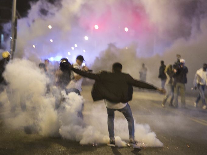 Một người dân đang đá một quả lựu đạn khói về phía cảnh sát chống bạo động, di chuyển về phía đám đông đang bạo loạn