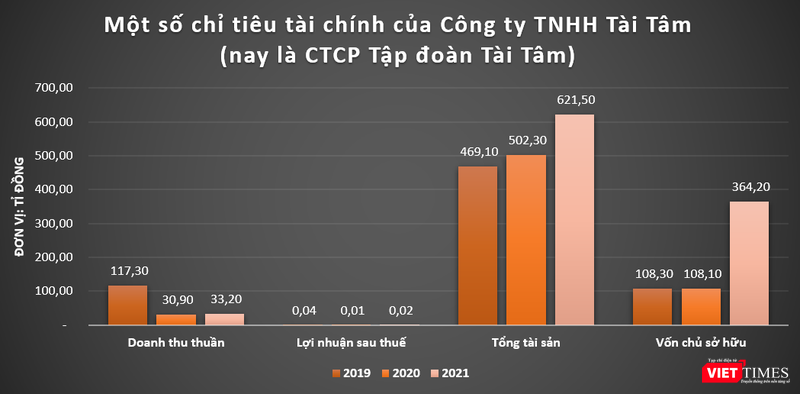 Theo dữ liệu của VietTimes, tính đến ngày 31/12/2021, tổng tài sản của Tài Tâm Group đạt mức 621,5 tỉ đồng, tăng 23,73% so với cuối năm 2020 và tăng 32,49% so với thời điểm cuối năm 2019.