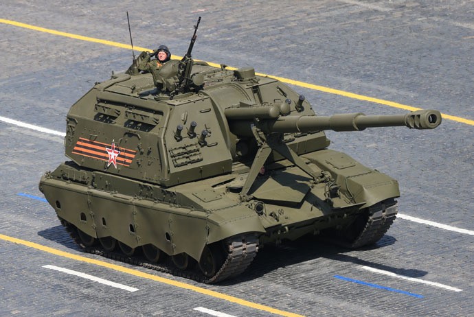 Các xe pháo tự hành Msta-S diễu hành trên Quảng trường Đỏ. Sau đó là những xe pháo tự hành Koalitsia hiện đại.