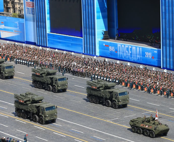 Xe chỉ huy BTR-82A dẫn đầu đoàn Pantsir-S / SA-22 Greyhound. Tiếp theo là S-400 Triumf, hệ thống phòng không tầm xa tiên tiến nhất của Nga, không có đối thủ tương xứng trên thế giới hiện nay.