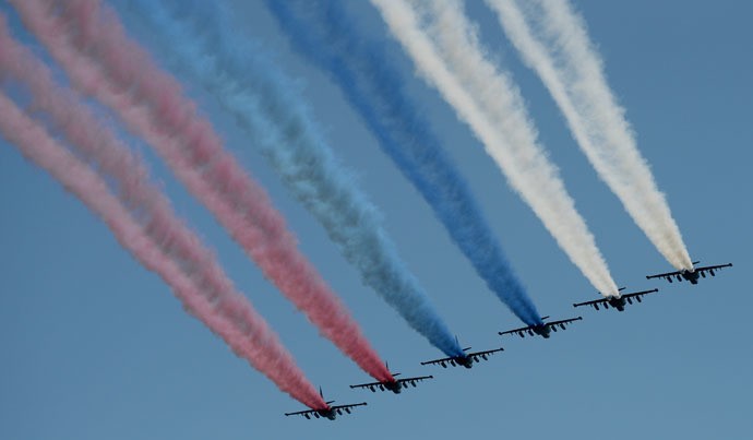 Một nhóm sáu Su-27 trên bầu trời sử dụng khói trắng, xanh và đỏ để trình diễn lá cờ Nga trên không.