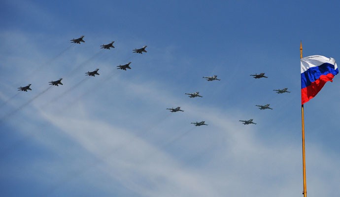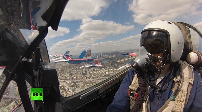 Nhóm phi công biểu diễn Vityaz và Strizh xếp hình kim cương. Họ thực hiện lượt biểu diễn với năm Su-27 và bốn MiG-29 bay chung và bắn pháo hoa.