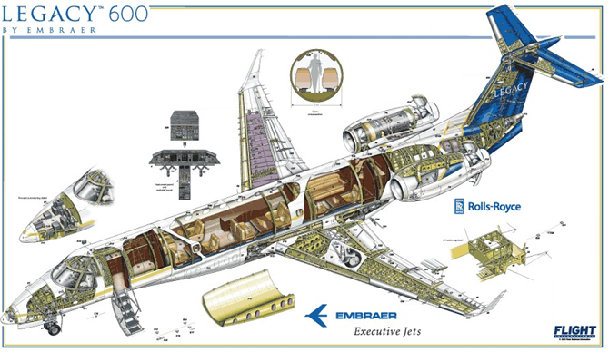 Trong 7 năm hoạt động, Legacy 600 đã bán được trên 130 máy bay đến hơn 20 quốc gia. Nó có 3 khu vực ghế ngồi với 16 ghế, hoặc có 19 đến 37 ghế trong kiểu ghế của máy bay chở khách thường trên Legacy Shuttle.