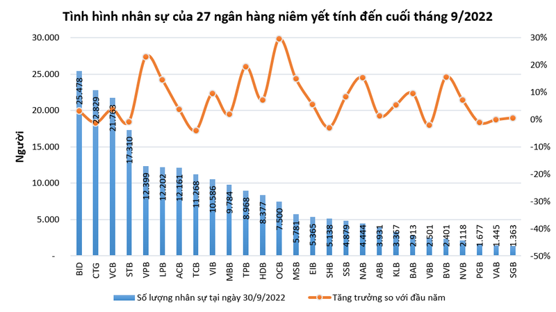 Trong 9 tháng đầu năm 2022, có 7/27 ngân hàng ghi nhận tốc độ tăng trưởng số lượng lao động so với đầu năm đạt trên 10%. Dẫn đầu là OCB với tốc độ tăng trưởng lên tới 29,6%, từ 5.785 người lên 7.500 người.