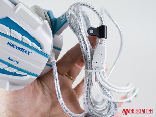 Là một sản phẩm thiết kế cho người dùng chơi game chủ yếu trên máy tính, nên Soundmax AH-316 cũng được nhà sản xuất kéo dài tối đa dây cáp tín hiệu âm thanh cho tai nghe. Với độ dài 2,3m, Soundmax AH-316 có thừa tiện dụng để người dùng kết nối tai nghe với các ngõ xuất âm thanh ở mặt sau thùng máy. Để đáp ứng nhu cầu đàm thoại qua môi trường Internet, AH-316 cũng được Soundmax tích hợp kèm micro ngay trên củ tai trái, trong khi đó, nút chức năng điều tiết âm lượng được bố trí ngay mặt sau củ tai và cũng khá vừa tầm tay.