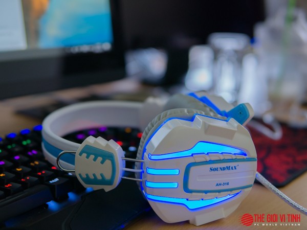 Soundmax AH-316 có thể xem là một phiên bản nâng cấp của mẫu tai nghe chơi game giá rẻ AH-313 đang có mặt trên thị trường. So với người anh em của mình, Soundmax AH-316 trông “hiền” hơn dù vẫn thiết kế sử dụng khá nhiều chi tiết cắt góc kết hợp với củ tai lớn và cụm đèn LED xanh dương ẩn hiện dưới mặt ngoài mỗi củ tai.
