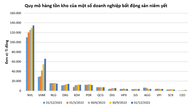 Một số doanh nghiệp bất động sản ghi nhận lượng hàng tồn kho tăng mạnh trong năm 2022 có thể kể đến như: CTCP Tập đoàn C.E.O (1.467,6 tỉ đồng, tăng 142%); Tổng CTCP Đầu tư Phát triển Xây dựng – DIC Corp (5.923,2 tỉ đồng, tăng 54%); CTCP Đầu tư LDG (1.205,9 tỉ đồng, tăng 15,4%); CTCP DRH Holdings (1.056,6 tỉ đồng, tăng 16,7%).