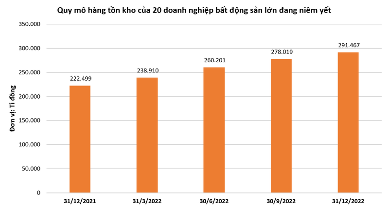 Thống kê từ báo cáo tài chính quý 4/2022 của 20 doanh nghiệp bất động sản niêm yết cho thấy, tổng giá trị hàng tồn kho của nhóm này đã vượt mốc 290.000 tỉ đồng, tăng 4,8% so với thời điểm cuối quý 3 và tăng 31% so với cuối năm 2021.