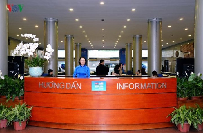 Quầy hướng dẫn đặt ngay ở sảnh vào là nơi cung cấp mọi thông tin cần thiết cho các phóng viên báo chí tác nghiệp tại sự kiện. (Ảnh: VOV)