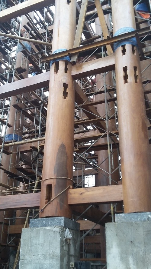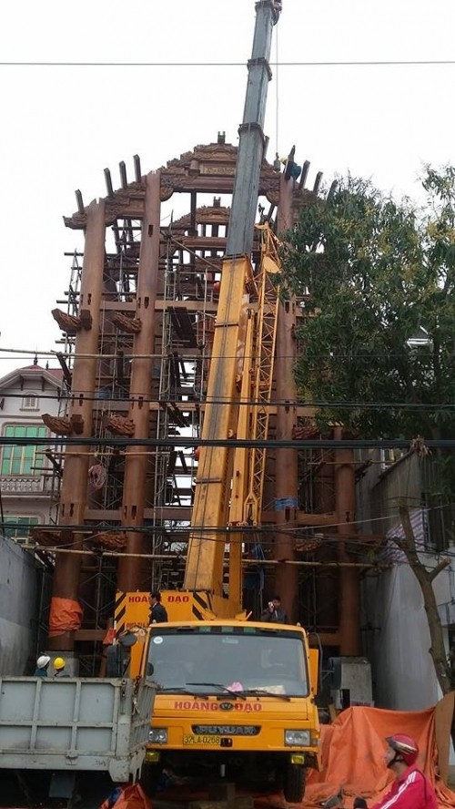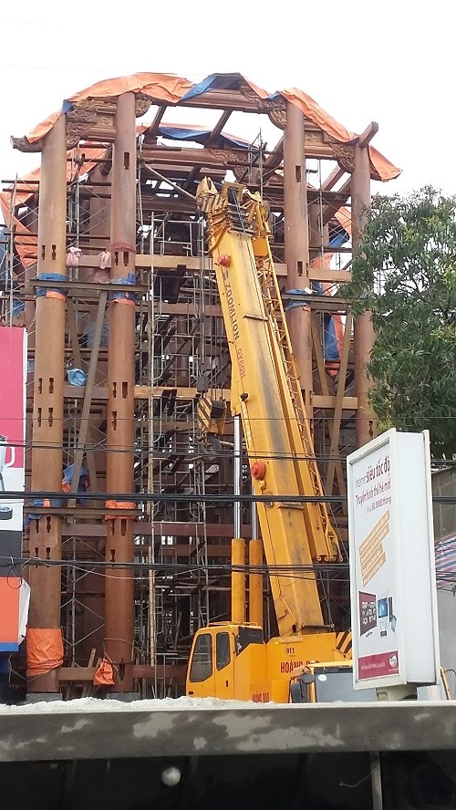 Do sử dụng nhiều cột gỗ lớn và dài nên đơn vị thi công đã phải huy động máy cẩu để đưa gỗ lên.