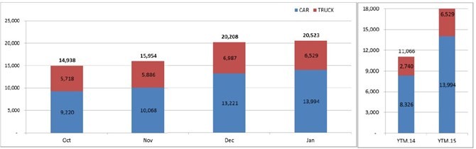 Trong số 19.979 xe đã tiêu thụ bao gồm 13.679 xe con và 6.300 xe tải. Doanh số xe con tăng 3% và xe tải giảm 10% so với tháng 12/2014.
