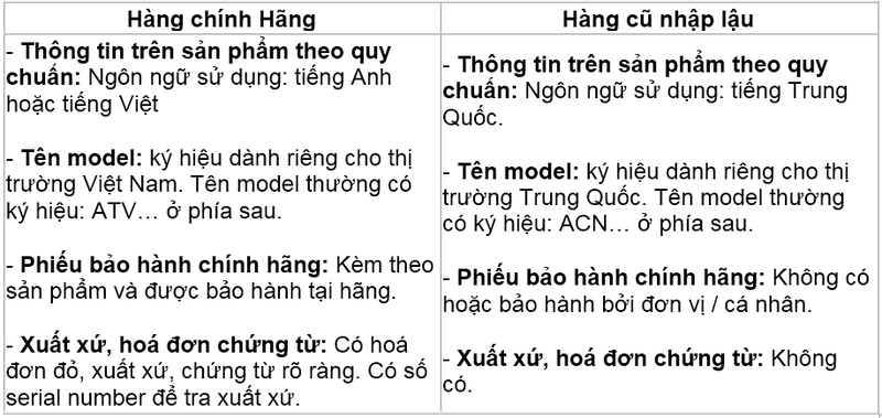 Dấu hiệu để nhận biết hàng lậu và hàng chính hãng là thông tin ở phía sau màn hình và số serial.