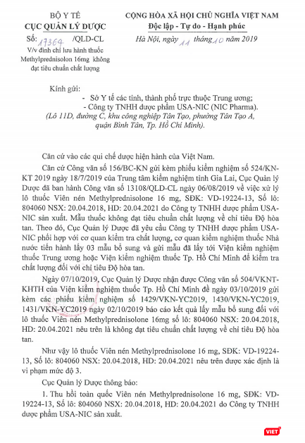 Căn cứ vào Phiếu kiểm nghiệm của Trung tâm Kiểm nghiệm tỉnh Gia Lai, Cục Quản lý Dược đã ban hành công văn xử lý lô thuốc viên nén Methylprednisolon 16mg do Công ty TNHH dược phẩm USA-NIC sản xuất, vì mẫu thuốc không đạt tiêu chuẩn chất lượng.