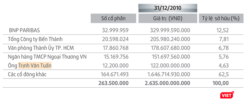Tài liệu mà VietTimes thu thập được xác nhận, cuối năm 2010, cá nhân ông Trịnh Văn Tuấn đã trực tiếp đứng tên sở hữu 12,2 triệu cổ phần OCB, tương ứng với 4,63% vốn điều lệ. Chưa kể người có liên quan và người ẩn danh.