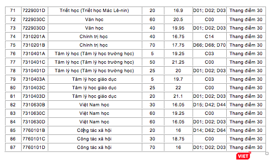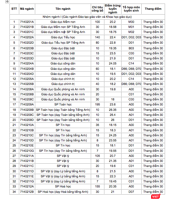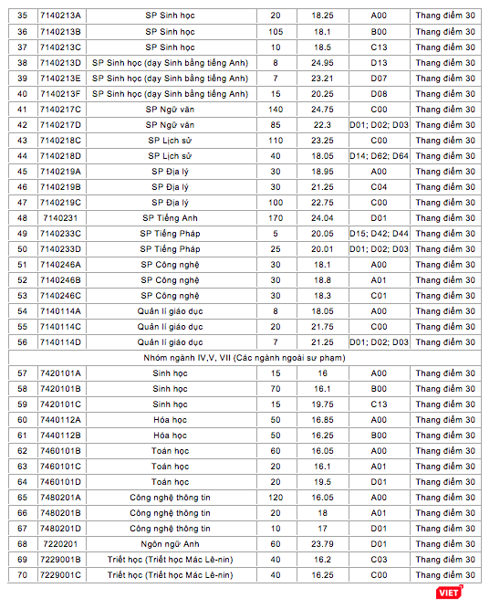 Điểm chuẩn xét tuyển vào các ngành của Trường ĐH Sư phạm Hà Nội:
