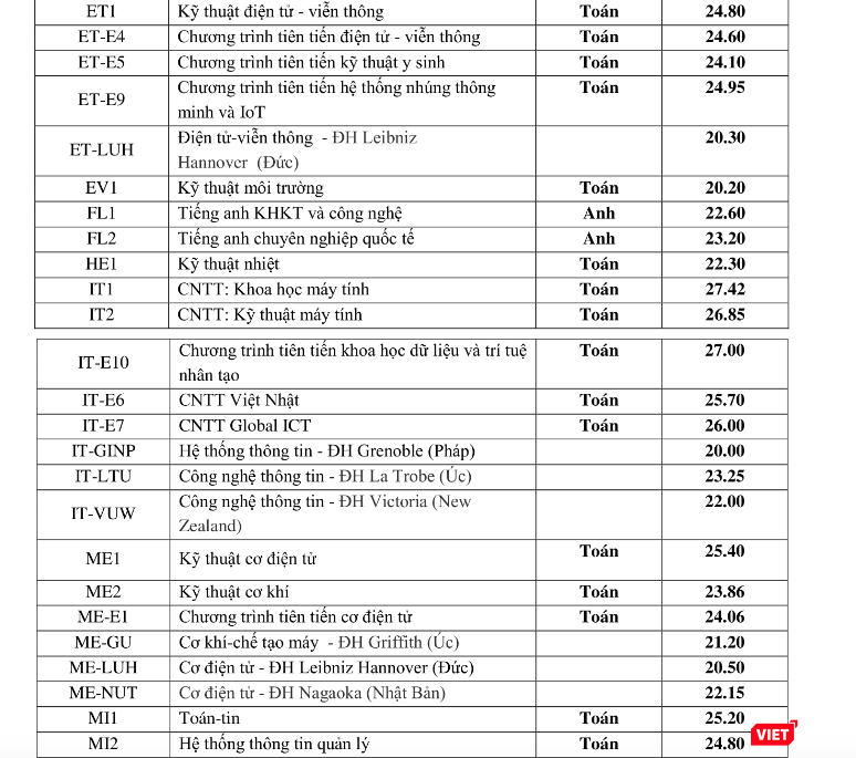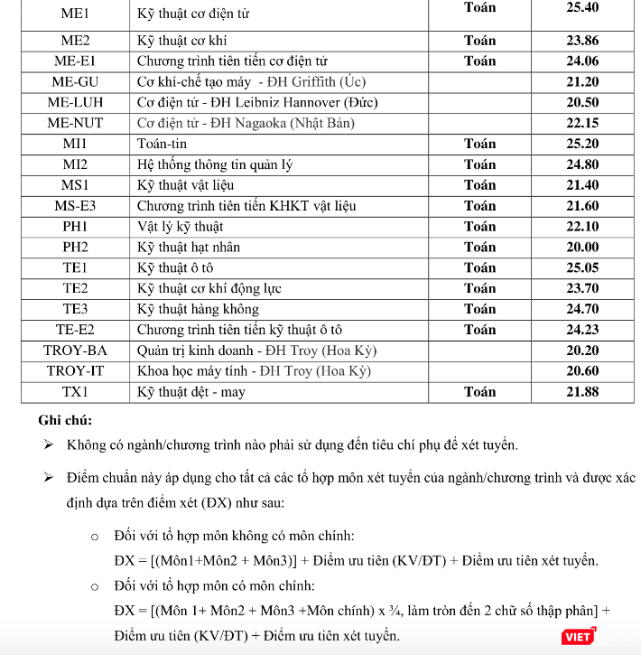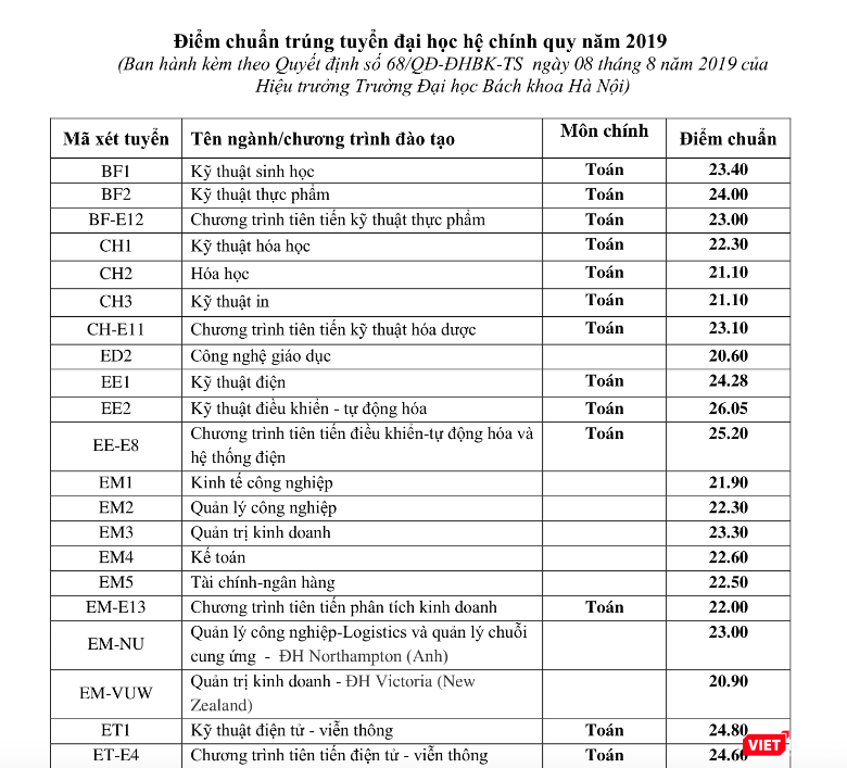 Dưới đây là điểm chuẩn trúng tuyển vào trường ĐH Bách khoa Hà Nội: