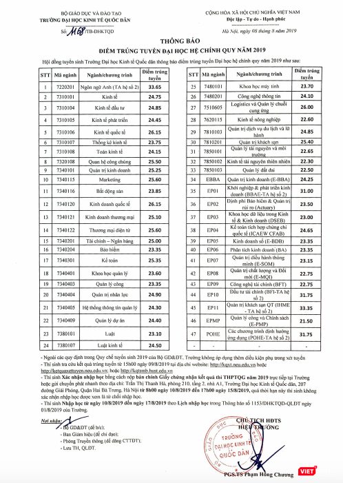Điểm chuẩn vào Trường ĐH Kinh tế quốc dân:
