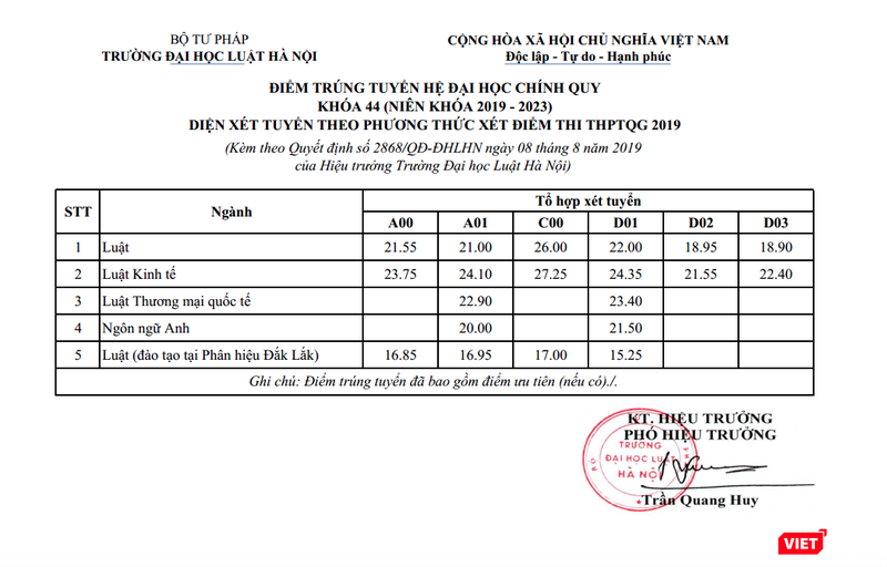 Điểm chuẩn trúng tuyển hệ ĐH chính quy của Trường ĐH Luật Hà Nội