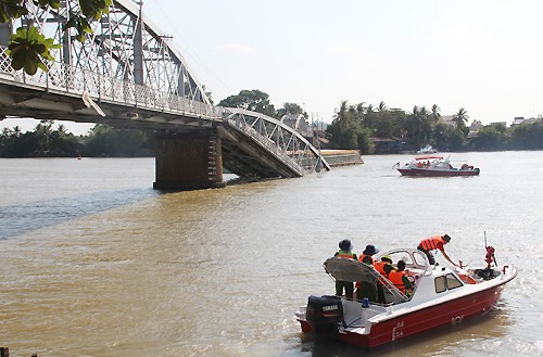 Theo ông Trung, lúc xảy ra, trên cầu có 3 người đi xe máy nhưng chưa rơi xuống sông. Còn hai tài công sà lan và tàu kéo bị rơi xuống nước nhưng được người dân cứu. Cả hai người này đang bỏ trốn.