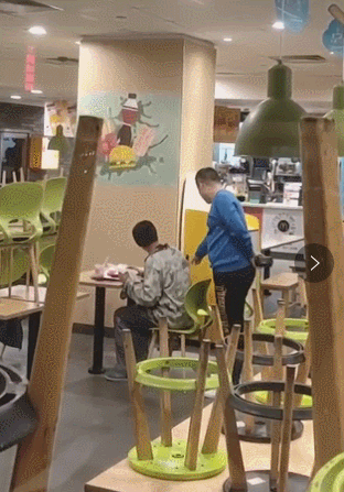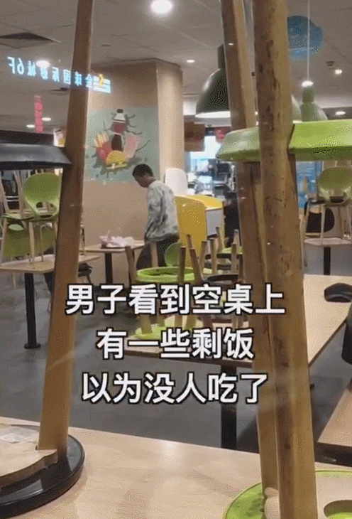 Trong quán ăn nhanh, một người đàn ông mặc quần áo rách rưới lưỡng lự hồi lâu trước khi bước đến một chiếc bàn trống. Trên bàn còn một số thức ăn thừa, người đàn ông nghĩ rằng khách đã về nên ngồi ăn ngấu nghiến.