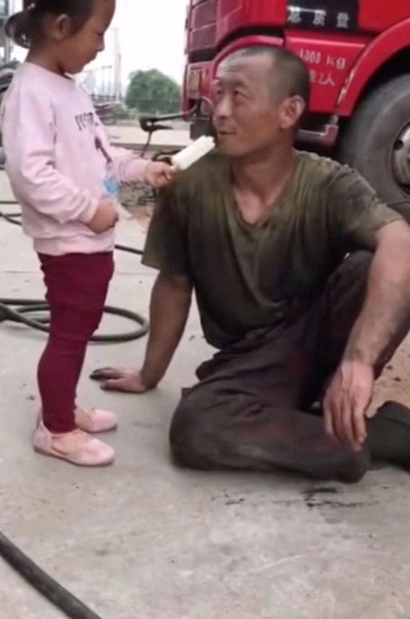 Cha ngồi sụp xuống đất nghỉ ngơi, thân thể lấm lem vết bẩn, quần áo ướt đẫm mồ hôi. Cô con gái nhỏ đưa cho cha một que kem. Anh nhìn con gái với một nụ cười, và sự dịu dàng không che giấu tràn ra ánh mắt.