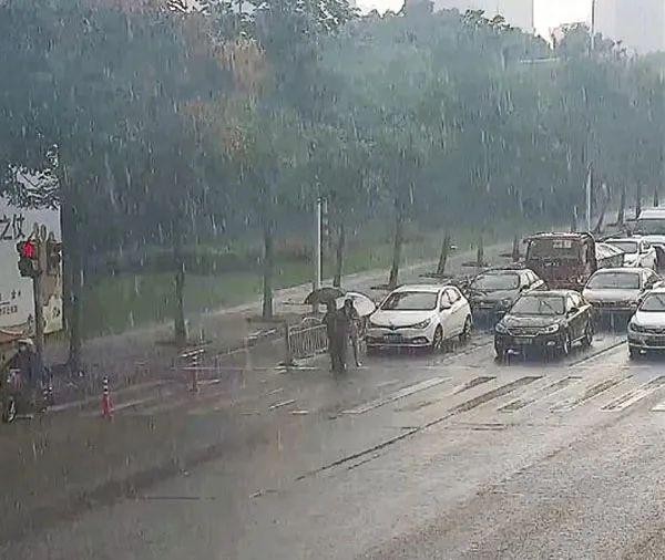 Ông lão vừa băng qua đường thì cơn mưa lớn ập đến.