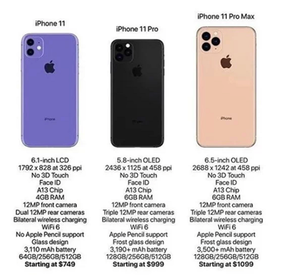 Cụ thể, máy được trang bị VXL A13, 6GB RAM, 3 camera với việc bổ sung thêm cảm biến góc rộng, hỗ trợ bút Apple Pencil. Ngoài ra, các mẫu iPhone mới có khả năng sạc nhanh hơn với USB-C to lightning, sạc ngược không dây, hỗ trợ mở khóa khuôn mặt FaceID ngay cả khi máy được đặt trên bàn. Mức giá dự kiến dành cho phiên bản iPhone Xr là 749 USD (khoảng 17 triệu đồng), iPhone 11 Pro sẽ là 999 USD, iPhone 11 Pro Max với mức giá không đổi 1099 USD.