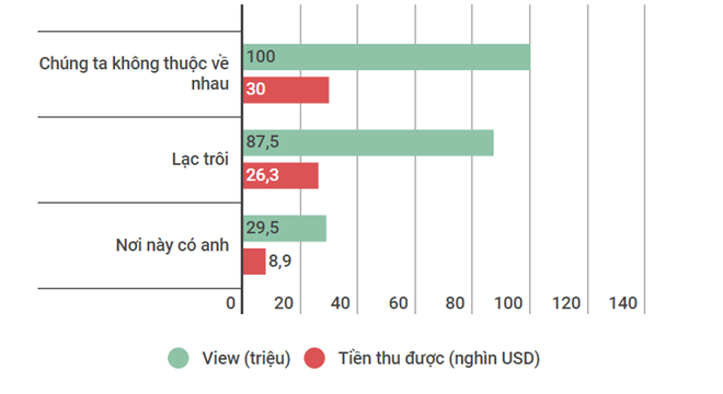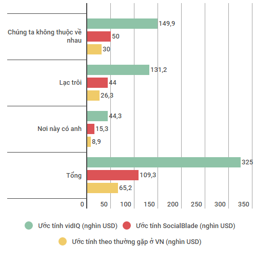 Theo công cụ vidIQ, 3 MV Nơi này có anh, Lạc trôi và Chúng ta không thuộc về nhau đã mang về cho Sơn Tùng M-TP hơn 325.000 USD, đây là con số ước lượng ở điều kiện hoàn hảo, với mỗi 1.000 view tương đương khoảng 1,5 USD.