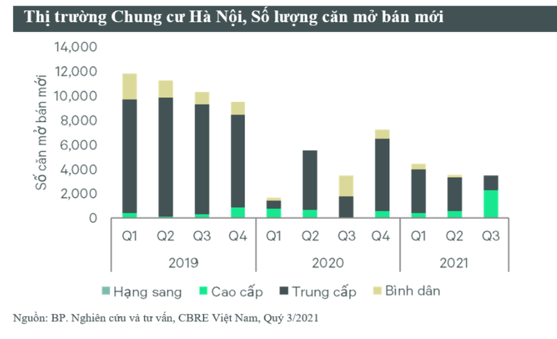 Dữ liệu của CBRE cho thấy, trong 9 tháng đầu năm 2021, nguồn cung bất động sản tại Hà Nội tăng trưởng nhẹ so với cùng kỳ năm trước, song vẫn thấp hơn đáng kể so với giai đoạn trước dịch bệnh.