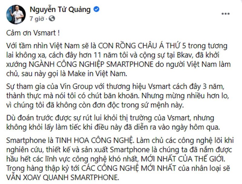 Ông Quảng viết rằng "Cảm ơn Vsmart" vì đã tạo ra sản phẩm Made in Vietnam, giành lại hơn 10% thị phần từ tay công ty nước ngoài.