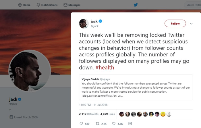 Trước đó một ngày, Jack thông báo khi kế hoạch bắt đầu được triển khai: "Chúng tôi sẽ xóa các tài khoản Twitter bị khóa (khi phát hiện được những hành vi thay đổi đáng ngờ) dựa vào từng profile trên toàn cầu. Số lượt theo dõi hiển thị ở trên profile có thể bị giảm", kèm theo hashtag #health.