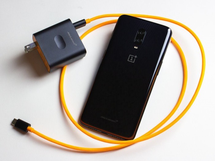 Sạc và dây của OnePlus 6T McLaren Edition. Đây là cục sạc nhanh, với công nghệ đặc biệt giúp điện thoại không nóng khi sạc. Sợi dây sạc còn được bọc dù với màu da cam rất lạ mắt.