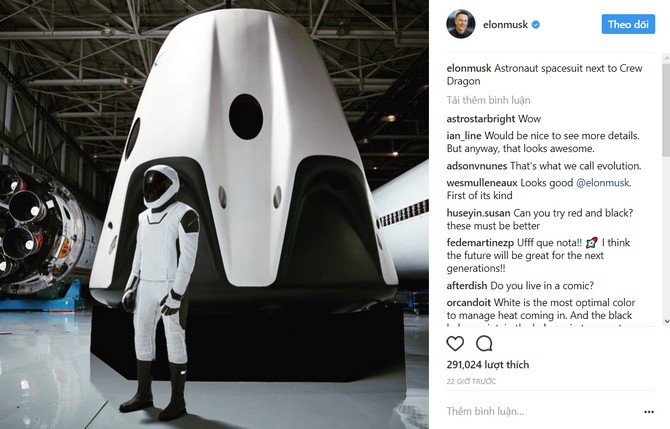 Theo Slashgear, bức ảnh được đăng tải thông qua tài khoản Instagram của tỷ phú Elon Musk đã thu hút rất đông sự quan tâm của công chúng. Trong ảnh là một phi hành gia mặc bộ đồ chuyên dụng đứng cạnh phi thuyền Crew Dragon của SpaceX. Đây cũng chính là phi thuyền sẽ đưa phi hành gia lên trạm không gian ISS.