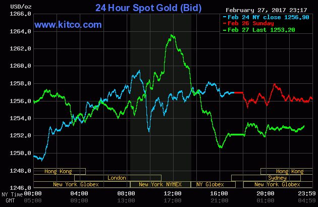 Chốt phiên giao dịch Thứ Ba và cũng là phiên cuối cùng của tháng, giá vàng giao tháng Tư trên sàn Comex tại Sở Giao dịch New York Mercantile đảo chiều giảm thấp $4,90 (-0,4%) về chốt tại $1.253,90/oz. Đóng lại tháng 2/2017, giá vàng tăng tổng cộng 3,5% - căn cứ theo dữ liệu của FactSet. Phiên Thứ Hai (27/2), kim loại quý này đã đoạt đỉnh kể từ ngày 10/11/2016 ở $1.258,80/oz.