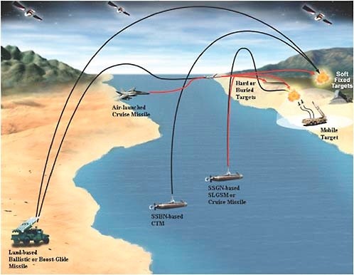 Đòn công kích bằng nhiều phương tiện mang PGS với tầm bay nhiều nghìn km tấn công các hệ thống tên lửa đạn đạo