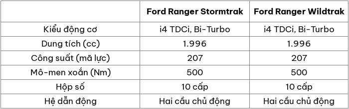 Cả hai phiên bản Ranger Stormtrak và Wildtrak hoàn toàn giống nhau khi đều sử dụng chung khối động cơ 2.0L i4 TDCi, Bi-Turbo cho công suất 207 mã lực với mô-men xoắn 500 Nm. Kết hợp với đó là hộp số tự động 10 cấp và hệ dẫn động hai cầu chủ động.