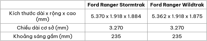 Xét về kích thước tổng thể có thể thấy cả hai mẫu xe Ford Ranger Stormtrak và Ford Ranger Wildtrak không có quá nhiều điểm khác biệt. Sự khác biệt sẽ nằm ở chiều cao của cả hai mẫu xe, trong khi Ford Ranger Wildtrak có chiều cao 1.884 mm thì mẫu xe Ford Ranger Wildtrak sẽ có chiều cao thấp hơn 9 mm.