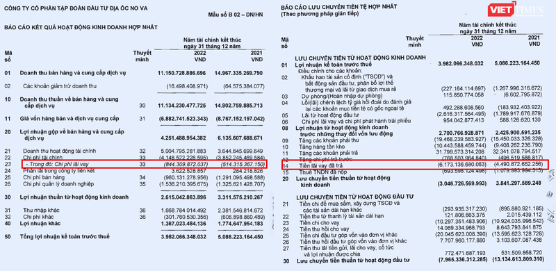 Đối với trường hợp của Novaland, Tiền lãi vay đã trả được ghi nhận trên báo cáo lưu chuyển tiền tệ năm 2022 có giá trị lên tới 6.173,1 tỉ đồng – cao gấp 7 lần chi phí lãi vay được ghi nhận trên báo cáo kết quả kinh doanh.