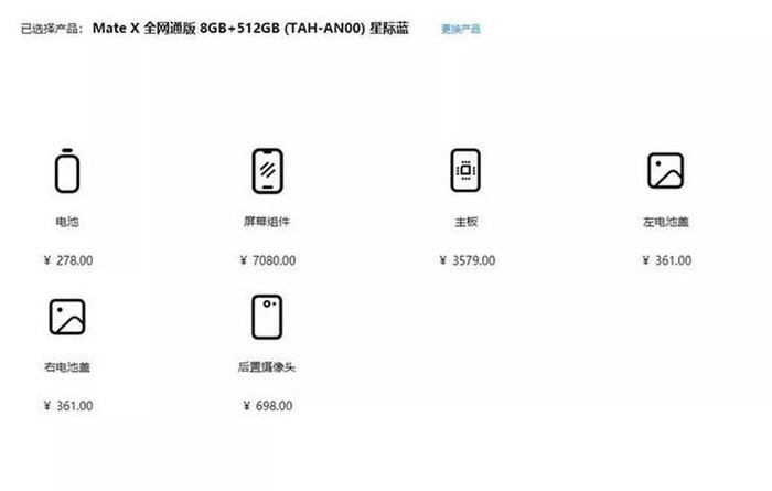 Bảng giá các linh kiện thay thế cho Mate X, trong đó mục có giá 7.080 tệ là màn hình.