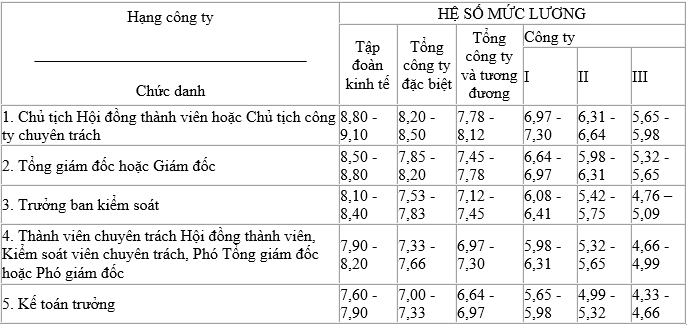 Theo đó, người quản lý công ty chuyên trách tiếp tục xếp lương theo hạng công ty quy định tại bảng dưới làm căn cứ để thực hiện các chế độ theo quy định của pháp luật cho đến khi Chính phủ có quy định mới. Cụ thể: