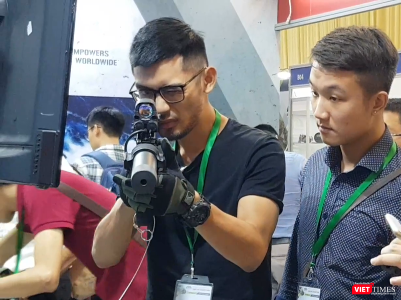 Khách thăm quan trải nghiệm súng đánh dấu tại gian hàng của Công ty TNHH MTV BCA Thăng Long