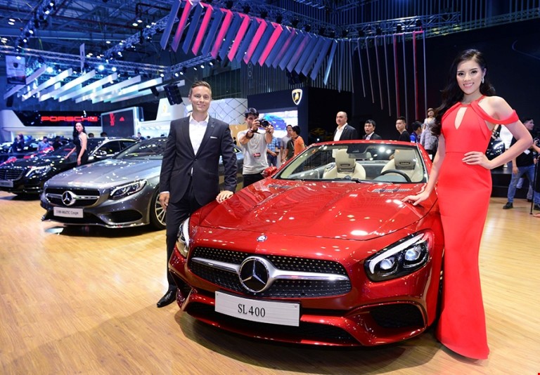 Mercedes-Benz. Một gian hàng được thiết kế với những tiêu chuẩn cao nhất cùng các mẫu xe hàng đầu như: E-Class, SLC 43 AMG “Dram Car”, chiếc sedan coupe thể thao CLA 200 Facelift, E 300 AMG… Nhưng nổi bật nhất là chiếc thể thao màu đỏ mui trần SL 400.