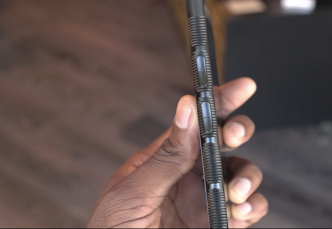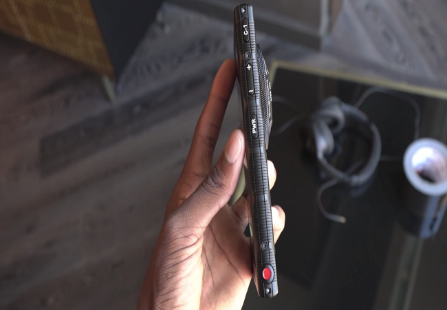 Các cạnh của chiếc điện thoại này được tạo rãnh để người dùng cầm cảm thấy chắc tay. Trên một cạnh có một nút nguồn thực hiện hai chức năng là một bộ quét vân tay, và là một nút chuyên dụng để quay video.