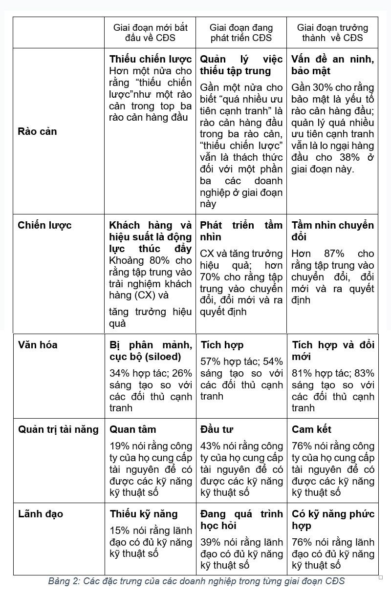 Những rào cản cho quá trình trưởng thành về mặt CĐS ở từng giai đoạn là khác nhau (bảng 1). Với giai đoạn bắt đầu, rào cản lớn nhất là thiếu một chiến lược CĐS phù hợp trong khi giai đoạn phát triển và trưởng thành, các công ty phải đối mặt với quá nhiều các ưu tiên và yêu cầu từ khách hàng, cổ đông, nhân viên. Mặt khác, vấn đề về an ninh và bảo mật cũng là một thách thức lớn với những công ty trưởng thành về CĐS.
