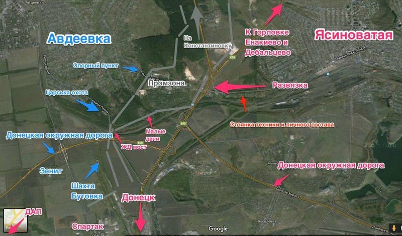 Đến thời điểm này, lực lượng quân sự Kiev đã tập trung một cụm binh lực lớn trong khu vực khu công nghiệp Avdeevka. Tăng cường cho lữ đoàn Lính thủy đánh bộ Ukraine số 72 là một tiểu đoàn chiến thuật của lữ đoàn đổ bộ số 81, một tiểu đoàn chiến thuật của lữ đoàn đổ bộ số 25, 900 chiến binh tình nguyện của lực lượng “Cánh hữu”, tiểu đoàn dân tộc cực đoan Azov, tiểu đoàn dân tộc cực đoan Dnhepr – 1. Tổng số cụm binh lực quân đội Ukraine có 30 khẩu pháo, 25 tổ hợp pháo phản lực, 10 đại đội bộ binh, 15 xe tăng, 20 xe BMP và 16 súng cối.