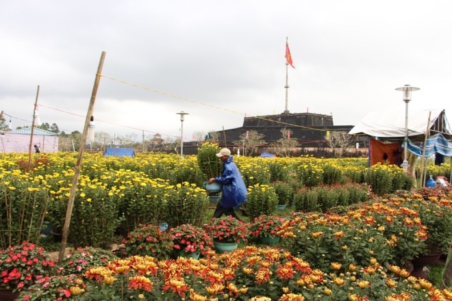 Sáng 26/1, trời xứ Huế nắng ráo trở lại, các chợ hoa lại đông khách. Các năm trước, khu vực Kỳ Đài Kinh thành Huế chật kín hoa cúc nhưng năm nay lượng bày bán chỉ bằng 1/3. Nguyên nhân do đợt lũ vừa qua, người trồng hoa cúc ở xã Phú Dương, Thủy Vân bị mất trắng do ngập sâu.
