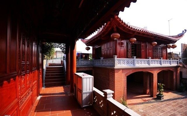 Nóc chạm trổ tinh tế hình rồng bay phượng múa. Bất kỳ một xà ngang, hay bậc cửa đều có các họa tiết, từ "long, ly, quy, phụng" hoặc "tùng, cúc, trúc, mai" hay đủ loại chim thú, hoa lá cỏ cây.
