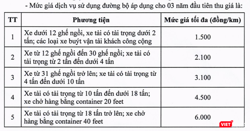 Quyết định cũng nêu cụ thể về mức giá dụng dịch vụ sử dụng đường bộ áp dụng cho 03 năm đầu tiên thu giá. Trong đó mức giá tối đa là 6.000 đồng/km, áp dụng cho xe tải có tải trọng từ 18 tấn trở lên; xe chở hàng bằng container 40 feet.