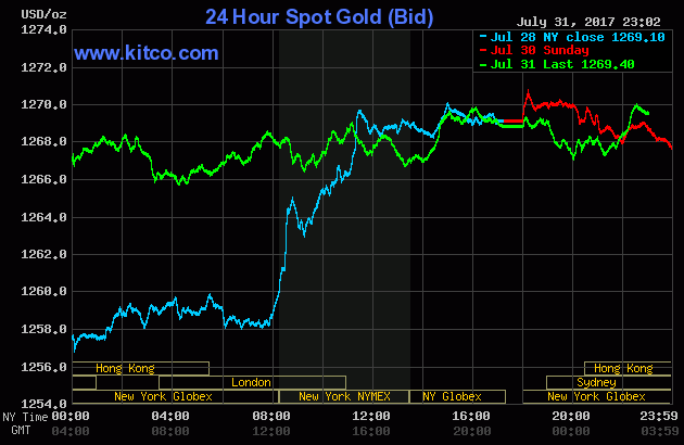 Chốt phiên giao dịch đầu tuần (Thứ Hai ngày 31/7), giá vàng giao tháng Mười hai trên sàn Comex tại Sở Giao dịch New York Mercantile giảm $1,80 (-0,1%) xuống chốt tại $1.273,40/oz. Đầu phiên, có thời điểm giá kim loại quý ngày đã chạm ngưỡng $1.277,30/oz – mức cao nhất bảy tuần. Tính cả tháng Bảy, giá vàng đã tăng 2,5% - theo dữ liệu của FactSet.